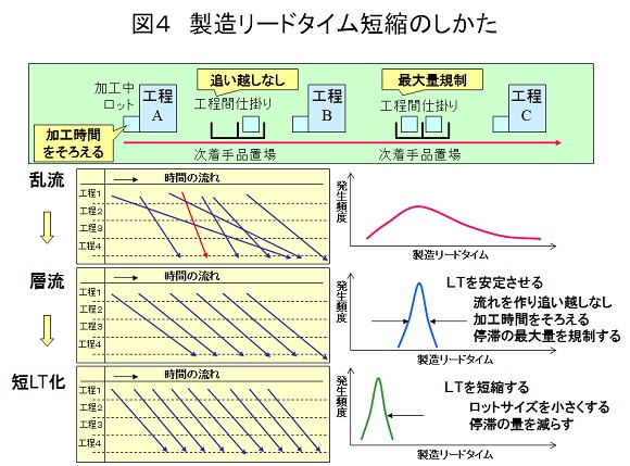 | この体験によって早くからリードタイムを切り口にした生産管理や納期管理の重要性に気付く事が出来たこと。実際に製造リードタイム短縮の仕事と生産管理の仕組み改善の仕事に多く取り組んでこられたこと。これらによって一気通貫生産方式と言う体系化された工場改革手法をマスターする事ができました。 まだ従来の現場改善の問題点がピンと来ず、一気通貫生産方式の有効性に疑問符がつく方は何かしらのきっかけで一気通貫生産方式のイメージが湧くことで理解が急速に深まる事になります。これまで改革のお手伝いをさせていただいた工場の方々もそれぞれ理解を深めるきっかけがありました。 人によって理解のタイミングときっかけは様々です。一気通貫生産方式の書籍を読んで。基準日程の作り方や製造LT短縮の仕方の説明を聞いて。ホワイトボードに書いた模式図での説明を聞いて。実際に短LTでのトライアル生産をしてみて。実際に工程の流が変わって。その工場のキーになる方が理解するとそれ以降は活動の推進スピードが明らかに上がっていきます。本講座のいずれかの記事が理解を深めるきっかけとして働くことを期待します。(図4、図5) |