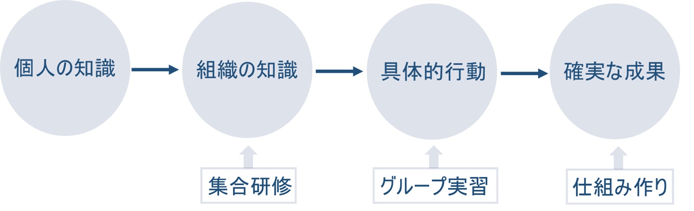 従来の研修では、知識の習得に主眼が置かれるために具体的な行動には結び付きにくい場合が多い。 また一人の意識が変わっても全体の意識に埋没してしまい、具体的な行動が起こせない場合が多い。